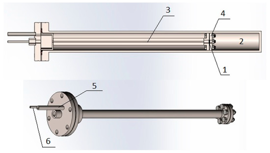 Preparing the installation. To study the permeability of hydrogen, a modified vacuum chamber is used, shown in Figure 5. The test sample is placed between the inlet and outlet volumes. Then, it is fixed with the help of plate 7. Gases are pumped out from the chamber through tubes 5 and 6 to a pressure of the order of 10−6 mbar. Using a high-temperature furnace, the gas chamber is heated to the required temperature.