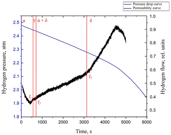 You can also notice that the rate of change of pressure in the inlet volume changes only after the completion of all phase transformations and complete breakthrough of hydrogen through δ-zirconium hydride. This may indicate that the rate of hydrogen sorption in the different phases of zirconium is the same.