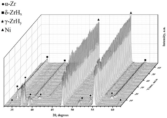 These points correlate well with the experimental data obtained by applying synchrotron irradiation for X-ray diffraction during the hydrogenation of the Zr–1Nb alloy from the gas medium [36]. At the temperature of 550 °C, the following data are available (Figure 7). From the graph, it can be noted that during the hydrogenation of the studied samples, the lifetime of the α phase is limited to 10 min. The metastable γ phase exists for no more than 5 min. Further, one can notice the presence of δ zirconium hydride.