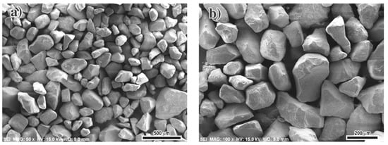 Scanning Electron Microscopy (SEM) micrographs showing the shape and size of the abrasive sand particles used for the wear tests. (a) 500 μm, (b) 200 μm. Note the presence of sharp particles of a mean size of 185 μm.
