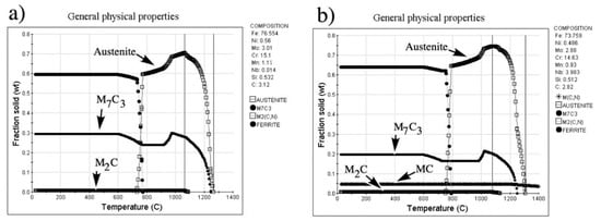 Phases predicted by JMatPro for the irons. (a) no-niobium additions (b) the iron with 3.98% Nb.