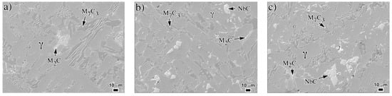 - Filipovic, M.; Kamberovic, M.; Korac, M.; Jordovic, B. Effect of niobium and vanadium additions on the as-cast microstructure and properties of hypoeutectic Fe-Cr-C alloy. ISIJ Int. 2013, 53, 2160–2166. [Google Scholar] [CrossRef]