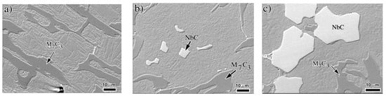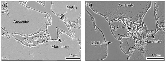 Figure 4 shows the as-cast microstructure for the three experimental irons. Note the presence of NbC in the matrix for the irons with 1.79% and 3.98% Nb, and that the amount and size of these carbides increase with the niobium content. These SEM micrographs show the real microstructure and Table 2 gives the measured amount of each phase and they are compared with the prediction of JMatPro. Note that the predicted and measured amounts of each phase are close, but a small difference was noticed since the real material does not solidify under equilibrium conditions as predicted by the software. The observed microstructure has been widely reported by several authors [,,,,,,,] for niobium alloyed white irons. For these measurements, the matrix was considered to be fully austenitic; however, it is well known that some martensitic transformation follows the cooling down process after solidification. Such a transformation takes place at the eutectic austenite and/or at the interface pro-eutectic austenite/eutectic carbide. Figure 5 shows evidence of the presence of martensite and M2C carbide in the 3.98% Nb iron; similar martensitic transformations were also observed for the other as-cast irons. It has been widely reported [,,] that during cooling down to room temperature the austenite close to the eutectic carbide gets impoverished in carbon and it is prone to transform to martensite []. The presence of molybdenum rich carbide M2C has been reported in white irons containing Mo, since this element partitions partially to the matrix, partially to the M7C3 carbide and also forms M2C [,,,].