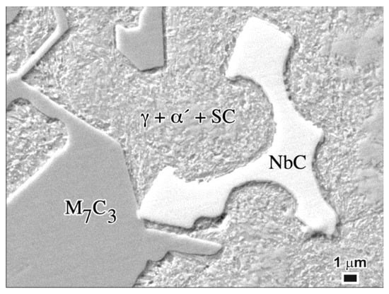 SEM micrograph showing detail of the as-heat treated microstructure of the 4% Nb iron, showing the matrix to be a mixture of retained austenite (γ’), martensite (α’) and secondary carbides (SC).