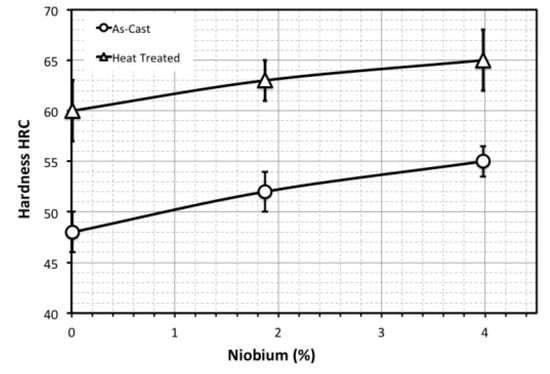 For the as-cast conditions, niobium additions increased the hard NbC phase since since it is a strong carbide-forming element. This caused a decrease in the eutectic M7C3 volume fraction from 30% for the iron without niobium to 24% for the iron with 3.98% Nb. However, NbC increased to 6%. The overall carbide volume fraction in the irons was about 30% but the presence of NbC in the Nb-added irons increased hardness from 48 to 55 HRC.