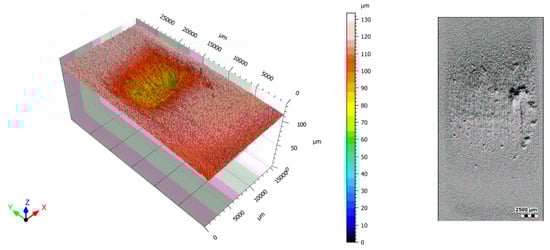 Topography of the worn surface of the 3.98% Nb, heat treated iron, generated by an optical profiler.