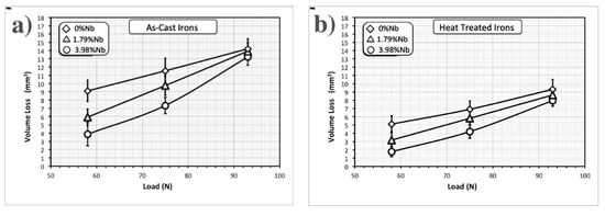 Volume loss load after the wear tests as a function of the applied load for both (a) as-cast and (b) heat treated irons. Note the increase in volume loss as the load increases, and the lower volume loss for the heat treated irons.