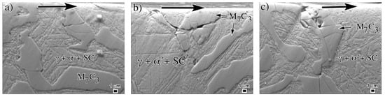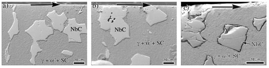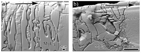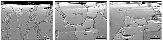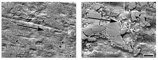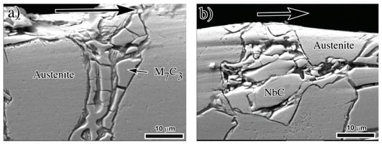 Carbides cracking at/or below the worn surface has been highlighted by several authors [,,,] to be an important cause of surface destabilization during the wear tests. Due to their hardness, carbides are the main responsible for the acceptable wear resistance of these irons; however, if the wear conditions are severe during the test, these carbides may be crushed or fragmented and under these conditions the surface is prone to loss high amounts of material. For the as-cast irons at this high load, the soft austenitic matrix does not offer the adequate support to the carbide phase. High levels of plastic deformation at the surface transfer high stresses to the brittle carbides producing cracking, particularly for large carbides []. Figure 13 shows detail of the carbide trituration due to severe plastic deformation of both M7C3 and NbC carbides at the surface of the as-cast 3.98% Nb iron.