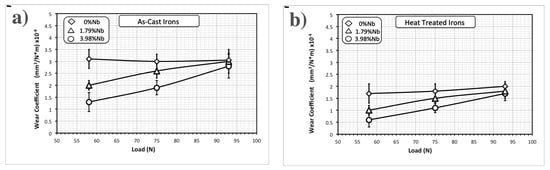Figure 17 shows plots of the wear intensity or specific wear rate for the experimental irons in both as-cast (Figure 17a) and heat-treated (Figure 17b) conditions. As can be seen, the wear rate is a constant for any load for the iron without niobium. At any load, the wear rate is the same since carbide cracking was observed for all the tests on these irons. However, for the irons with niobium additions, the wear rate increased with load and decreased with the niobium content. This behavior also evidence that for high loads the presence of hard NbC carbides does not offer too much wear resistance due to carbide cracking at these high loads.