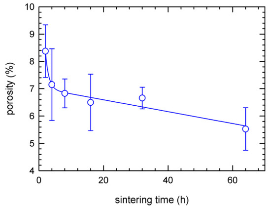 The average grain size is plotted in Figure 9 as a function of the sintering time at 1400 °C. The mean grain size increased with the sintering period from 25 μm after 2 h of sintering to 60 μm after 64 h of sintering. The grain size of each specimen remained unchanged (with respect to the experimental scatter) during 1200 °C/1h annealing.