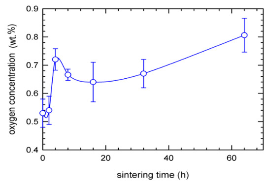 The oxygen content was measured for the sintered and as-pressed (sintering time 0h) specimens. A slightly increasing oxygen content with an increasing sintering time can be seen in Figure 2 (despite the large experimental scatter).