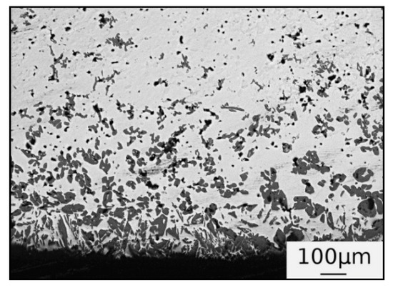 Microstructure after sintering at 1400 °C/64h. The specimen surface area at the bottom (LM).