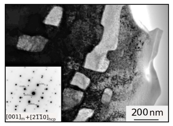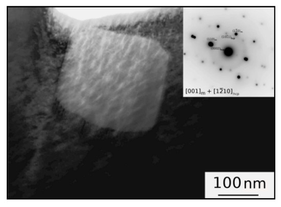 Microstructure of the 64h + 1200 °C/1h/WQ sample with a hcp phase (TEM-SAED).