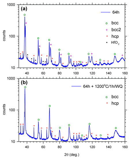 Numerous precipitates can be seen in the microstructure of the sintered specimens (Figure 3, Figure 4 and Figure 5). An example of the XRD pattern of sample “64h” is plotted in Figure 6a. The XRD analysis confirmed the presence of two bcc and one hcp phases. Additionally, a very small fraction (<1 wt.%) of (Hf, Zr)O2 oxides was detected in the “64h” specimen. This could be ascribed either to the local contamination of the specimen or to a higher oxygen content (see Figure 2) which may lead to (Hf, Zr)O2 formation. The dominating phase, i.e., matrix, denoted here as “bcc”, has the bcc structure with the lattice parameter a = 3.399(8) Å and its chemical composition is close to the equimolar concentration HfNbTaTiZr (see Table 1). The bcc matrix contains precipitates which have either a bcc or a hcp structure. The precipitates with a bcc structure, denoted “bcc2”, exhibit a lattice parameter a = 3.347(3) Å, which is lower than that of the bcc matrix. According to EDS analysis, the bcc2 precipitates are enriched in Ta and Nb (see Table 1). The precipitates with hcp structure, denoted “hcp”, are characterized by lattice parameters a = 3.205(3) Å and c = 5.113(7) Å and are rich in Hf and Zr (see Table 1). It was determined by XRD analysis that the fraction of the Zr- and Hf-rich phase (hcp) is lower than that of the Ta- and Nb-rich phase (bcc2) in the sintered specimens (see Table 2), which is consistent with the SEM observations (Figure 3d,e). One type of precipitate is located both in the vicinity of the grain boundaries and in the grain interiors (see Figure 3d,e). The EDS analysis revealed that both of these precipitates are Ta- and Nb-rich phases (i.e., bcc2 phase; see Table 1). Other precipitates of irregular shapes could be observed along the grain boundaries (also depicted with arrows in Figure 3e). These precipitates were typically smaller in size (up to 1 μm). They were indexed as hcp phase according to TEM-SAED analysis (Figure 5) and were enriched with Zr and Hf (see Table 1). It has to be mentioned that, in some cases (especially for the hcp phase), the precipitates were so fine that the EDS signal could partly originate from the surrounding area. Due to this reason, more measurements were taken throughout all the specimens and the values summarized in Table 1 are the average chemical compositions. Additionally, the significantly coarser (few tens of μm) hcp precipitates (Hf- and Zr-rich) were observed along the edge of the specimens (Figure 4) and locally also inside the “64h” specimen (see Figure 3d depicted by a white arrow). These precipitates were of a similar irregular shape to the fine ones. According to TEM-SAED analysis, the hcp precipitates had an orientation relationship with the matrix {110}matrix//{0001}hcp and [001]matrix//hcp (Figure 5).