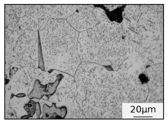 An example of the XRD pattern of sample “64h+1200 °C/1h/WQ” is plotted in Figure 6b. In contrast to the as-sintered samples, no bcc2 phase was detected in the samples annealed at 1200 °C for 1 h and water quenched. The XRD analysis of the 1200 °C/1h/WQ samples revealed only the presence of a single bcc phase (matrix) with slightly broadened peaks and a certain fraction of the hcp (Hf, Zr-rich) phase (Table 2).The microstructure of the quenched samples consisted of equiaxed grains with numerous fine precipitates located both along the grain boundaries and inside the grain interiors (see Figure 7). The TEM analysis (see Figure 8) proved that the fine precipitates in the solution-treated specimens were hcp particles with the same orientation relationship {110}matrix//{0001}hcp and [001]matrix//hcp as in the as-sintered specimens. Water quenching also resulted in the emergence of cracks within some specimens, which indicated a high internal stress caused by the high cooling rate and limited plasticity at room temperature.