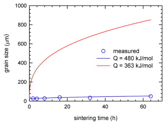 Grain size vs. sintering time. Experimental data are plotted by circles; the development of grain size calculated using Equation (1) (see in chapter 4. Discussion) for Q = 363 kJ/mol and Q = 480 kJ/mol is plotted by solid lines.