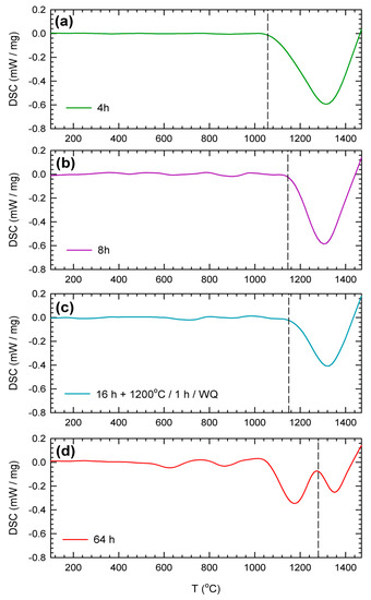 The DSC curves for the sintered samples heated at the heating rate of 7 °C/min (Figure 10) show a significant endothermic peak starting at approximately 1050 °C with a maximum at around 1300–1350 °C. The endothermic peak can be attributed to the dissolution of the secondary phases (bcc2 and hcp). In order to find the origin of the endothermic peak, DSC measurements were also taken of the samples annealed at 1200 °C and quenched in water. The DSC curve of the “16h+1200 °C/1h/WQ” sample plotted in Figure 10c exhibits a similar endothermic peak to the sintered alloys (Figure 10a,b). Note that the DSC curve of the sample “64h” contains two separated endothermic peaks. The peak in the range 1250–1450 °C, ascribed to dissolution of the hcp phase, is preceded by an endothermic peak occurring in the temperature range 1050–1250 °C (see Figure 10d).
