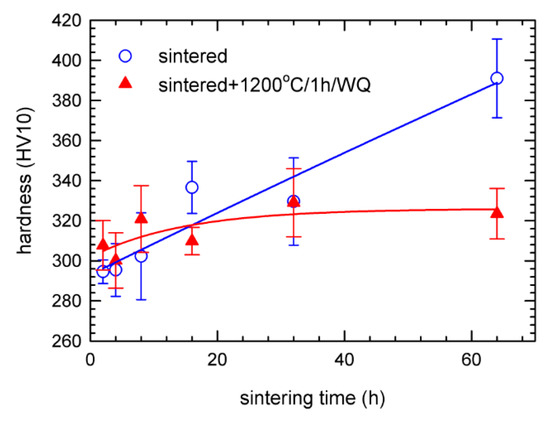 The development of hardness with the sintering time for the samples after sintering and the samples subjected to annealing at 1200 °C/water quenched.