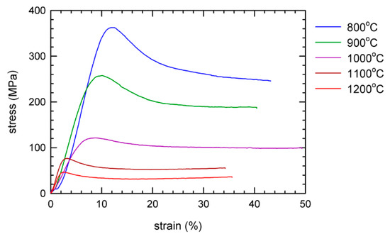 The results of the compression tests of the “16h” specimens are summarized in Figure 12. The tests were performed at the strain rate of 10−4 s−1 at elevated temperatures. As can be seen from the figure, the ultimate compressive strength was the highest at 800 °C (approx. 370 MPa) and then decreased at 900 °C, and again at 1000 °C; the further decrease in strength after increasing the temperature above 1000 °C was not significant. A lowest strength of 47 MPa was acquired for the 1200 °C sample.