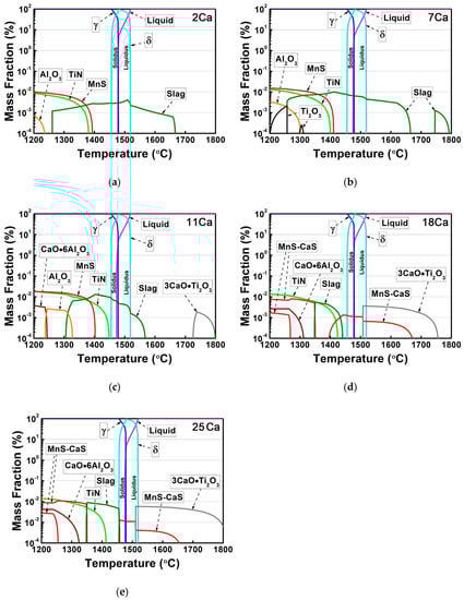 Mass fractions of different phases in the HSLA steels: (a) 2Ca, (b) 7Ca, (c) 11Ca, (d) 18Ca, and (e) 25Ca as a function of temperature by FactSage software under the equilibrium condition.