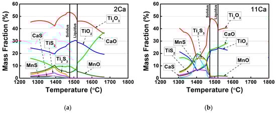 Compositions of the slag phase in the HSLA steels (a) 2Ca and (b) 11Ca as a function of temperature by FactSage software under the equilibrium condition.