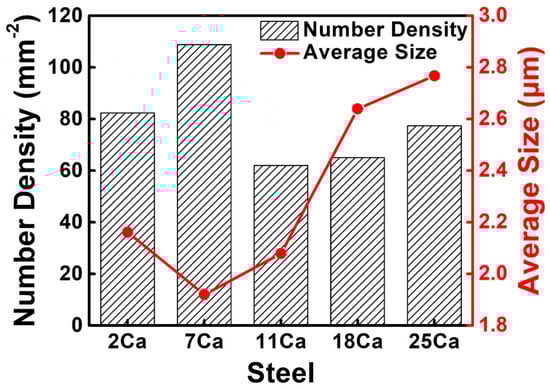 The quantity and size of the non-metallic inclusions in the HAZs of the thick HSLA steel plates were analyzed within a relatively large area (>25 mm2), with the effective statistics on the number of the inclusions larger than 1700 for each steel. Figure 3 shows the number density and size of the total non-metallic inclusions in the HAZs of these steel plates with different Ca concentrations. The number densities of the inclusions were approximately comparable, about 60–80 per mm2, except for the 7Ca steel with the highest value. The average inclusion sizes in the 2Ca, 7Ca, and 11Ca steels were relatively small, but the sizes increased significantly to larger than 2.6 μm in steels 18Ca and 25Ca.