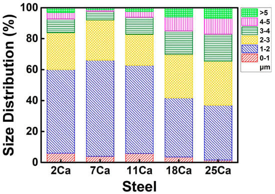 Figure 4 shows the size distribution of the total non-metallic inclusions in the HAZs of these steel plates with different Ca concentrations. Fine inclusions were formed in the 2Ca, 7Ca, and 11Ca steels, particularly the inclusions with a size smaller than 2 μm, accounting for larger than 60%. These inclusions were coarsened in the 18Ca and 25Ca steels, particularly the obvious increase in the proportion of the inclusions with the size larger than 3 μm.