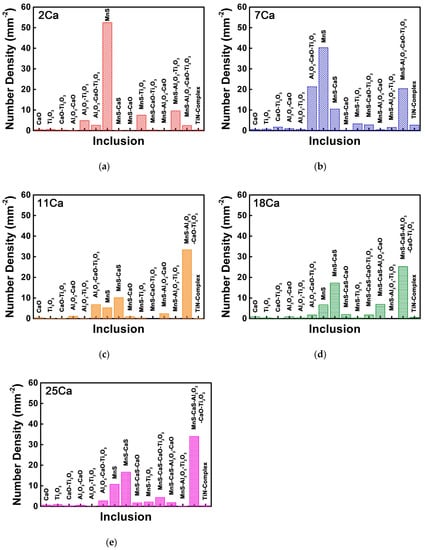 Number densities of each type of the non-metallic inclusions in the HAZs of the thick HSLA steel plates (a) 2Ca, (b) 7Ca, (c) 11Ca, (d) 18Ca, and (e) 25Ca after large heat input welding at 400 kJ cm−1.