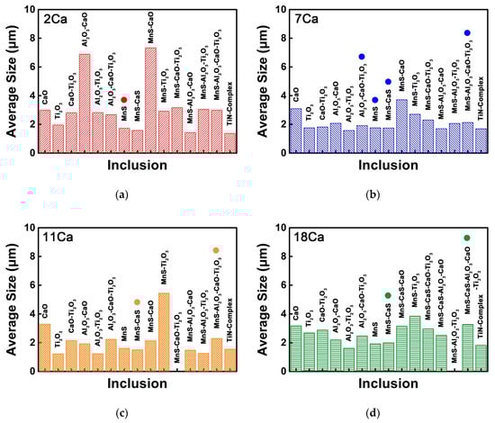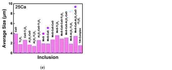 Figure 6 shows the size of each type of the non-metallic inclusions in the HAZs of these thick HSLA steel plates with different Ca concentrations, in which the inclusions with the number density larger than 10 mm−2 are marked by circles. The average size of the pure MnS sulfide with the largest number density in the 2Ca steel was measured to be 1.7 μm, smaller than the average size of the total inclusions (Figure 6a). Figure 6b shows that the average size of the most types of the non-metallic inclusions in the 7Ca steel had a decrease compared to the 2Ca steel, particularly the size of the MnS–Al2O3–CaO–Ti2O3 and Al2O3–CaO–Ti2O3 oxysulfides. In the 11Ca steel, the average size of the MnS–Al2O3–CaO–Ti2O3 oxysulfide was measured to be 2.3 μm, and its higher proportion slightly increased the average size of the total inclusions (Figure 6c). When the Ca content was increased to 18 and 25 ppm, CaS sulfide formed and the average size of the CaS-bearing MnS–CaS–Al2O3–CaO–Ti2O3 oxysulfide increased to 3.3 and 3.4 μm, respectively (Figure 6d,e), much larger than the size of the MnS–Al2O3–CaO–Ti2O3 oxysulfide in the 7Ca and 11Ca steels.