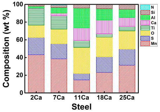Furthermore, the average compositions of Mn and S in these non-metallic inclusions decrease and then increase as the Ca content increases (Figure 7). The quantity statistics in Figure 5 suggests that the decrease in the Mn and S concentrations in the 2Ca and 7Ca steels is ascribed to the decline in the number density of the pure MnS and MnS–CaS sulfide, while the content increase in the 18Ca and 25Ca steels is owed to the growth of the MnS–CaS sulfide on the oxysulfide surface. As regards the 11Ca steel, the lowest number density of the pure MnS and MnS–CaS sulfide gives rise to the minimum concentrations of Mn and S.