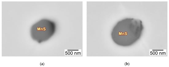 Previous studies have pointed out that the MnS sulfide can be classified into three types depending on its morphology: Type I (globular), Type II (rod-like), and Type III (angular), and the three types will be changed gradually as the Al content increases [,]. The pure MnS sulfide in the experimental HSLA steels forms the spherical morphology, a typical Type I sulfide (Figure 8), owing to the Al concentrations controlled below 100 ppm (Table 1), the threshold for Type II sulfide alternation. This Type I sulfide forms through the metastable monotectic reaction below the solidus temperature: