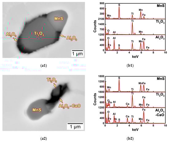 in which the Liquid(2) phase is enriched in MnS. Moreover, Oikawa et al. have highlighted that the molten oxide droplets can serve as nuclei for the separation of the liquid MnS and promote the monotectic reaction, leading to the spherical morphology []. Therefore, besides the pure MnS sulfide shown in Figure 8, the MnS part in Figure 9(a1,a2) can also be recognized as the Type I sulfide, together with the oxide nucleus (Ti2O3 and Al2O3–CaO) formed in the solid region.