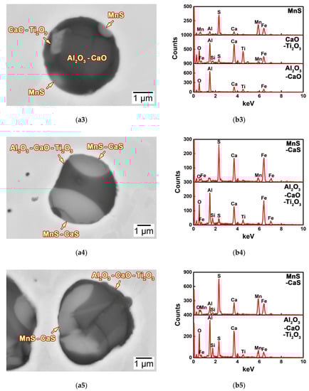 Figure 9(a4) shows the morphology of a typical MnS–CaS–Al2O3–CaO–Ti2O3 complex oxysulfide with the largest quantity in the 18Ca steel. The Al2O3–CaO–Ti2O3 complex oxide was wrapped by a MnS–CaS complex sulfide (Figure 9(b4)), revealing a spherical and relatively large morphology. It is interesting that the formation of the CaS sulfide significantly increased the size and area fraction of the complex sulfide, and thus increased the content of Mn, Ca, and S (Figure 7). The morphology and composition of this MnS–CaS–Al2O3–CaO–Ti2O3 complex oxysulfide in the 25Ca steel were similar to that in the 18Ca steel (Figure 9(a5,b5)).