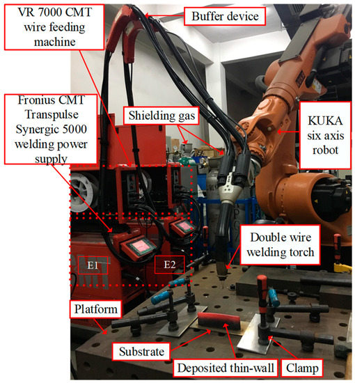Two 316L stainless-steel wires with 1.2 mm diameter and 250 mm × 100 mm × 5 mm 316L base plate were selected for the test. Before the test, the plate surface was polished. The CMT welding additive manufacturing system consisted of two Fronius TransPlus Synergic 5000 CMT (Fronius International GmbH, Wels, Austria) welding power supplies, two VR 7000 CMT wire feeders (Fronius International GmbH, Wels, Austria), a high-precision KUKA six-axis robot (KUKA Roboter GmbH, Augsburg, Germany) and a double-wire welding gun (Fronius International GmbH, Wels, Austria) with hydraulic water-cooling system, which is shown in Figure 1.