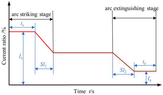 Current setting curve of arcing and extinguishing in the welding process are shown in Figure 2. Where Is and Ie are respectively the proportion of arc striking and extinguishing current to the average deposition current. Furthermore, ts and te represent the time of arc striking and extinguishing, respectively. However, Sl1 and Sl2 represent the transition of arc striking and extinguishing to welding stage, respectively.