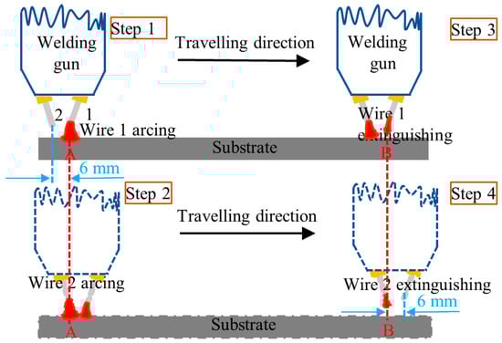 Increasing wire feeding speed means increasing the current in single-wire deposition, which will result in a limitation in improving efficiency. The double-wire process could not only realize different compositions of alloy deposition [16], but also further improve the deposition efficiency [17]. However, as arc striking and extinguishing process also influence the deposition morphology [18], arc striking and extinguishing sequence of each wire need to be coordinated in double-wire AM, but there are few studies on arc striking and extinguishing process optimization in double-arc additive manufacturing.