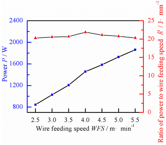 where R represents the heat consumed by the welding wire per millimeter with the unit of J·mm−1, P and WFS represent the power and wire feeding speed of a welding supply with the unit of W and m·min−1, respectively. The relationship curve between WFS and power of CMT+P welding machine is shown in Figure 5, the curve approximately presented a unified linear relationship. In addition, R was stabilized at about 21 J/mm. With the increase of wire feeding speed, R increased first and then decreased, and reached maximum as WFS was 4 m/min, which indicated that the power of the welding machine increased and then decreased slightly with the deposition rate increased. Therefore, when the WFS/TS ratio was certain, with increasing the wire feeding speed, the corresponding heat input would increase and then decrease slightly.