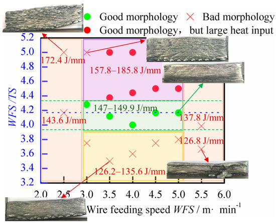 A total of 21 experiments with different TS were carried out to observe the effect of WFS/TS ratio and thermal input on the morphology of samples. The indicators that evaluated the morphology quality of samples were whether the deposition was cocked or unmelted, had a mixed layer and flowing, which were shown by different colors dotted lines in pictures of Table 3. The results showed in Figure 6 indicate that with different wire feeding speed, the WFS/TS ratio and the thermal input obtained by various travelling speed were different. In Figure 6, the red crossings represent poor morphology, and the red solid circles indicate good morphology but higher heat input for the low speed. Under the same arc mode, the grain size would be coarse and the performance would be degraded for large heat input [22], so these points were all not the optimal process parameters. From the above analysis, it could be seen that no matter how the speed changed by CMT+P process, as the WFS was 2.5 m/min, the deposition was not continuous and the right part cocked, while when WFS reached to 5.5 m/min, the molten metal began to flow. The green solid circles in the green area represent well-formed deposition, the range of their wire feeding speed, the WFS/TS ratio and the heat input were about 3–5 m/min, 4–4.28 and 147–149.9 J/mm, respectively. Therefore, the WFS/TS ratio of one wire by the CMT+P process in deposited double-wire 316L stainless steel is about 4, and the maximum WFS can be up to 10 m/min at the travelling speed of 120 cm/min, especially, its deposition rate of 5.4 kg/h is higher than 5 kg/h by CMT process reported in reference [23].