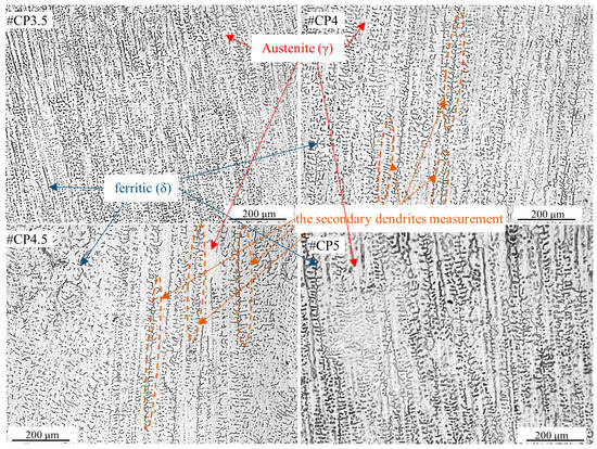 As the wire feeding speed and travelling speed increased and the heat input was constant, the columnar grains in #CP3.5 were obviously small and the ones were obviously coarser in #CP5, however, there was no significant difference between #CP4 and #CP4.5, the grain size of them should be measured to analysis. As the number of secondary dendrite arms and distance could be counted to calculate the secondary dendrite spacing, the average of three measurements at different locations in Figure 7 was calculated, which represented the average size of the grains in #CP4 and #CP4.5. The secondary dendrites distance of #CP4 and #CP4.5 were 1.2 ± 0.195 μm and 1.51 ± 0.194 μm, respectively, which indicated that the columnar grain size was gradually became coarser and larger from sample #CP3.5 to #CP5. This was mainly due to the increasing travelling speed, which led to slower heat dissipation and more serious heat accumulation, resulting in a decrease in temperature gradient and increase in grain growth [26].