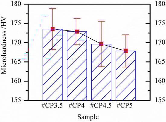 The average value of Vickers hardness measured in the middle of the cross section of the four samples is shown in the column diagram in Figure 8. With the increase of the speed, the thermal input did not change, and the hardness decreased slightly, indicating that the increase of heat accumulation made the grain coarse and the hardness decrease.