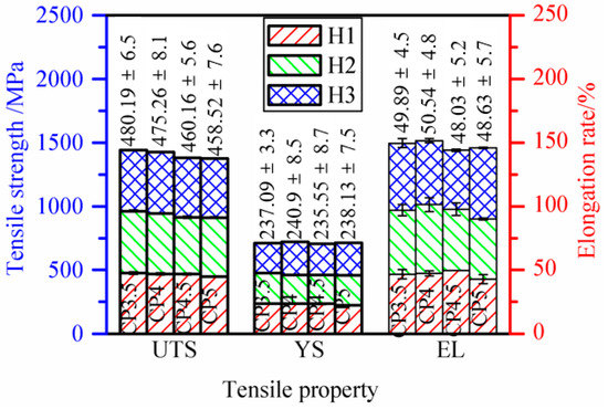 Tensile results of deposition samples (UTS, YS and EL represent ultimate tensile strength, yield strength and elongation rate respectively).