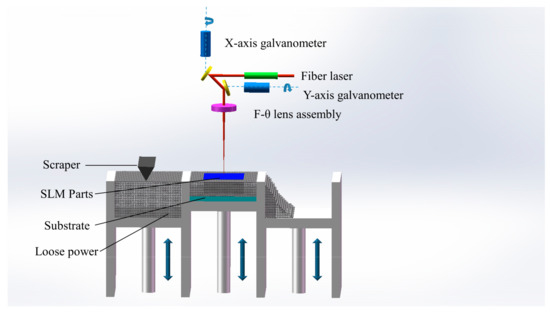 SLM technology is an additive manufacturing technique in which metal powder is completely melted under the action of the heat of a laser beam and solidified by cooling [3]. SLM is a promising additive manufacturing process that has the advantage of forming complex geometries [4]. SLM uses a high-energy laser beam to selectively melt metal powder and directly form dense metal parts, as shown in Figure 1. SLM uses the principle of discrete-stacking to produce metal according to the 3D CAD slice model of the part. The powder layer-by-layer deposition is superimposed into a three-dimensional object, which can form complex parts quickly and cost-effectively, to realise the individualisation, as well as small batch productions. However, the current SLM process is not fully capable of meeting the serial production and manufacturing efficiency requirements of large-scale components. The most efficient way to increase the rate of the laser forming process is to match thicker powder layers at higher scan speeds and higher laser power conditions. Currently, there are three main strategies to improve the building efficiency, which include using internal multi-layer filling, increasing the scanning speed and the thickness of the powder layer under high laser power and increasing the number of laser scanning heads [5]. The first method is to reduce the internal filling scan time. The device is equipped with a dual laser (small spot low-power fibre laser + large spot high-power fibre laser), which scans the outer shell of the part through a small spot fibre laser, after forming the N layer. The large-spot fibre laser is used to scan the inner core, and the N-layer inner core is directly formed by high power, thereby improving the forming efficiency. The second method to increase the scanning speed and the thickness of the powder layer is under high laser power. However, increasing the laser power causes the laser spot diameter to increase which may affect the accuracy and, therefore, the physical and mechanical properties of the part. The third way is to increase the number of laser heads in the same forming size space, thereby rapidly improving the efficiency. This technology is most commonly used by equipment manufacturers to improve scanning efficiency through multi-laser head partitioning. During the partitioning, the two galvanometers are responsible for the intersection of the areas being scanned. According to the working conditions, the two galvanometers of the current layer are responsible for the scanning area of the area compared to the smaller galvanometer, and bear the cross-region scanning. It has become a research objective to develop a multi-beam matching forming process and improve forming efficiency to achieve multi-beam matching and high-precision additive manufacturing [6].