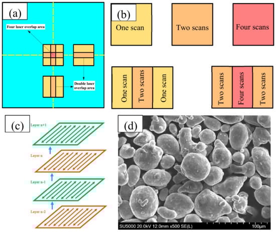 (a) Laser bonding area schematic; (b) experiment design of multi-laser manufacturing; (c) SLM scan direction; (d) SEM of AlSi10Mg powders.