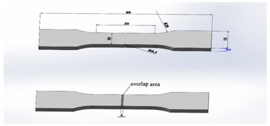 The as-built specimens were removed from the aluminium base plate by wire EDM cutting. Keller’s reagent was used to etch polished specimens. The phase identification was identified through an X’Pert—Pro X-ray diffractometer (D/max-rB, Rigaku Corporation, Tokyo, Japan). The XRD test used working power 10 kW, working current 250 mA, working voltage 40 kV, step size 0.02°, scanning speed 5°/min, and scanning range 20–90°. A Zeiss optical microscope (OM) (Axio Scope A1, Carl Zeiss, Jena, Germany) for low-magnification, a Hitachi SU-5000 scanning electron microscopy (SEM) (SU-5000SEM, Hitachi Ltd., Chiyoda-ku, Tokyo, Japan) and a Tescan VEGA3 scanning electron microscopy (SEM) (VEGA3 SEM, Tescan China, Ltd., Brno, Czech Republic) for high magnification were used to observe the microstructures of samples. The elemental analysis was investigated using an energy-dispersive spectrometer (EDS), which was performed on the SEM device. Tensile properties of this experiment were tested using a microcomputer-controlled electronic universal testing machine (CMT5105, MTS Industrial Systems (China) Co. Ltd., Shenzhen, China). Tensile samples in isolated areas and overlap areas were built according to Figure 4 in this experiment. The overlap width of the tensile samples is 1 mm. The overlap areas of the tensile samples were scanned twice. The tensile speed of the pattern is 0.02 mm/s. Each mechanical property data is the average of two valid data.