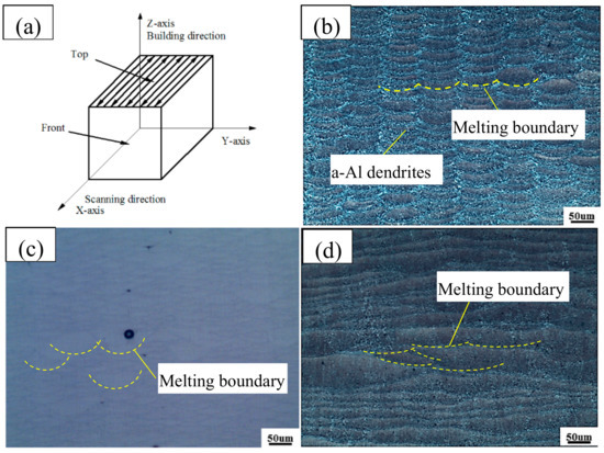 - Ghasri-Khouzani, M.; Peng, H.; Attardo, R.; Ostiguy, P.; Neidig, J.; Billo, R.; Shankar, M.R. Comparing microstructure and hardness of direct metal laser sintered AlSi10Mg alloy between different planes. J. Manuf. Process. 2019, 37, 274–280. [Google Scholar] [CrossRef]