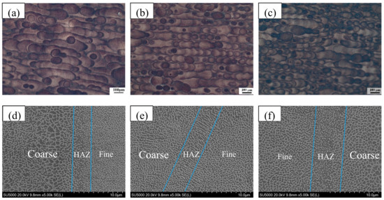 Figure 6 shows the top surface microstructure of the SLM-formed AlSi10Mg alloy. In Figure 6a–c, the formation of the melting trajectory can be seen. The upper and lower layers observe the bidirectional laser scanning trajectory, and the upper strip or cylindrical fine blister structure is solidified. The reason for the melting trajectory is that since the raw material for SLM forming is a spherical powder, the spherical powder generates a liquid phase and spreads out in the process of absorbing laser energy and melting. It can be seen from the melting trajectory of the lower layer that the laser spot is formed into a line, and the tightly melted plane between the line and the line is relatively flat, indicating that the process parameters of the SLM process are accurate and no large holes nor looseness are observed, which also indicates that the powder has good fluid flow performance. The porosity between the powders is low and the density is higher after the laser is melted and formed. It can be seen from Figure 6d–f that a coarse crystal region is formed at the boundary of the molten pool region, mainly coarse cell crystal. The reason for this formation is mainly due to the re-melting of the solidified alloy by the laser scanning line, so that the solidified alloy re-crystallises, and the crystal grains grow again and form a coarse crystal region. A fine-grained zone is formed in the centre of the molten pool zone, mainly composed of finely dispersed cell crystals. The reason for the formation is mainly due to the temperature gradient in the centre of the molten pool area, which is the smallest, the solute distribution is relatively uniform, and the supercooling degree is formed at the front edge of the interface, which generates a large number of crystal nuclei, and the rapid solidification inhibits the growth of the crystal grains, thereby forming a fine grain area [3,15]. The other side of the coarse grain zone is the heat affected zone, mainly coarse particles. Combined with the XRD analysis (Figure 7), the particles can be judged to be coarse eutectic Si. The reason for the formation is mainly because the position of the solidified region close to the coarse crystal region is affected by the heat transfer of the laser scanning line, and the chaos of the eutectic Si is increased to form a self-shaped crystal. In the fine-grained zone inside the molten pool, the Al–Si eutectic structure precipitates between the alpha Al dendrites, and its morphology is a fine network structure with a width of <1 µm. The primary alpha Al phase is Al–Si eutectic. Surrounding this is the coarse-grained zone is located at the boundary of the molten pool. Since the primary α-Al grows here in the form of cell crystals, the morphology of the Al–Si eutectic structure is a nearly circular network with a width between 1 and 3 µm. It can be seen that the Al–Si eutectic structure at the boundary of the molten pool is clearly roughened when compared with the inside of the molten pool. The heat affected zone (HAZ) is located outside the molten pool, and the laser is formed by the secondary heating of the laser during the scanning process of the previous layer. The cycle causes the Al–Si eutectic structure to be decomposed, the network Al–Si eutectic structure is gradually interrupted, and the morphology is close to the spherical particles [16].