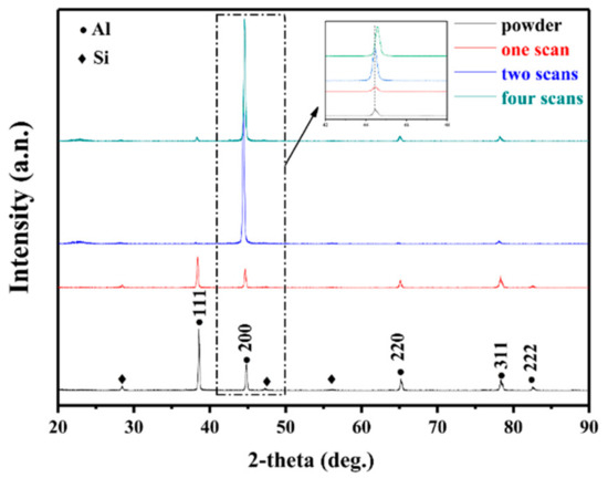 No Mg2Si was found in the XRD pattern, which is consistent with previous studies on the AlSi10Mg alloy manufactured by SLM [17,18]. However, there are also some studies of Mg2Si for XRD detection [19,20]. This may be because the amount of Mg in AlSi10Mg is too small, which is lower than the detection ranges of the machine. As the number of laser scans increases, the rate of solidification also increases. As a result, a Si-formed solid solution is found in the Al matrix, and failed to precipitate in the form of primary silicon and eutectic silicon. This results in a decrease in the peak of Si and an increase in the peak of α-Al. The preferred orientation shown is the (200) plane. This texture is usually produced by preferential solidification in the (100) cube texture along the building direction [3,21]. This is related to the microstructure and texture characteristics of AlSi10Mg produced by the SLM process.