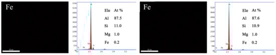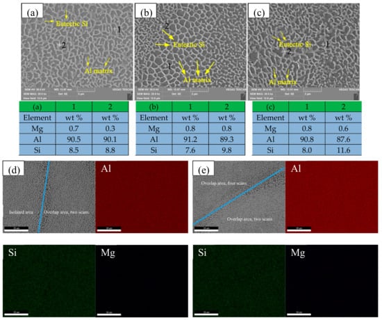 Figure 8 shows the SEM image of the cross section of the SLMed AlSi10Mg samples. The grey island-like regions are columnar dendritic α-Al matrixes, and the white mesh-like regions are eutectic precipitated Si phases. The Si phase is uniformly distributed in a network on the α-Al matrix. The factors leading to the appearance of this micro-morphology are mainly due to the rapid formation of liquid molten pools during SLM forming. The presence of convection causes the liquid phase in the molten pool to reach liquid phase equilibrium and each element is evenly distributed, and the Si element is evenly distributed in the Al matrix. During rapid cooling, the process of element segregation is suppressed, and grain growth is limited. Si will rapidly nucleate and grow in the Al matrix during rapid cooling. There are many Si atoms in the Al matrix and the distribution is uniform, so a small range of aggregation occurs to a certain extent. It can be seen from Figure 8a–c that there is no significant change in the element content of the samples in one scan, two scan, and four scan. It can be seen from Figure 8 that the Al, Si and Mg elements in the sample are uniformly distributed, and there is no macro-segregation. As can be seen from Figure 8d,e, the size of the lap area is relatively large, which is because the lap area has undergone two and four times of laser scanning, which is equivalent to remelting. There is thermal accumulation, and the grain has the opportunity to grow further. The distribution of Mg element is relatively uniform and there is no trend of enrichment. Figure 8d,e shows a field of view randomly selected by a scanning electron microscope and the area is scanned face-to-face, and the distribution of the Mg element of the Si element of the Al element of Fe element is listed. As can be seen from the distribution of the elements in the figure, in the selective laser melting of AlSi10Mg alloy, due to its extremely fast cooling rate, it can reach 103 K/s, and the element distribution is uniform at this cooling rate.