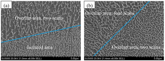 Figure 5b shows the morphology of the microstructure of one scan. The layers of the weld line are overlapped and the shape is clearly visible. The red dotted line in the figure is the boundary of the molten pool where the dendrites are thicker than the inside of the molten pool and grow in a cell shape with an average primary dendrite spacing λ1 of 1.5 µm; the internal dendrites are relatively small and grow in dendrites, with an average primary dendrite spacing λ1 of less than 1 µm. The dendrites have a typical epitaxial growth characteristic, that is, the branches grow to the top along the bottom of the molten pool, although there are sub-structures in which the dendrite growth directions are inconsistent at local locations in the same molten pool. Figure 5c is a microscopic diagram of the two scans where the red dotted line is the boundary of the molten pool, which becomes larger. Figure 5d shows the microstructure of four scans from which it can be seen that the boundary of the molten pool becomes linear and blurred.