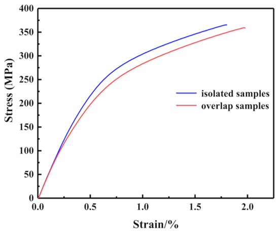 In this experiment we mainly studied the tensile strength of the overlap areas of two laser scans, where Table 2 and Figure 10 shows the tensile properties of the samples in this work. As can be seen from Figure 10 the tensile curves of the samples are similar, and thus the tensile properties are not much different. The average ultimate tensile strengths, yield strength and elongation of isolated and overlap samples are 370 MPa, 360 MPa, 100 MPa, 95 MPa, 2.0% and 1.8%, respectively. The tensile strength and yield strength of the sample were good, but the elongation was low, indicating that the fracture toughness of the alloy was low. SLM is a high-speed melting and solidification process in which very small particles of structure are formed in the sample. Therefore, the strengthening of the AlSi10Mg alloy can generally be considered as grain refinement strengthening. Grain refinement can increase tensile strength and, according to the Hall–Petch theory, the grain refinement increases the number of crystal grains contained in the same volume, and the internal dislocations become less. When the part is subjected to an external force, the deformation occurs between a large number of crystal grains. Additionally, the slip of the dislocation is blocked by the grain boundary, so that the expansion cannot be continued, thereby achieving fine grain strengthening. Although the tensile properties of the sample scanned by the laser have decreased, the tensile properties variation is not particularly remarkable as the multi-laser overlap area tensile properties are the same as the isolated area.